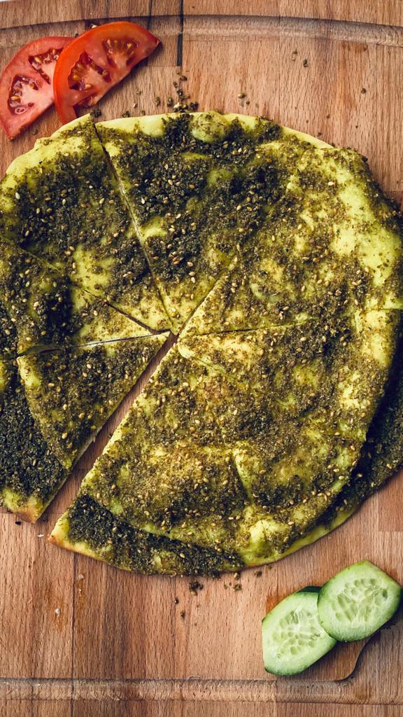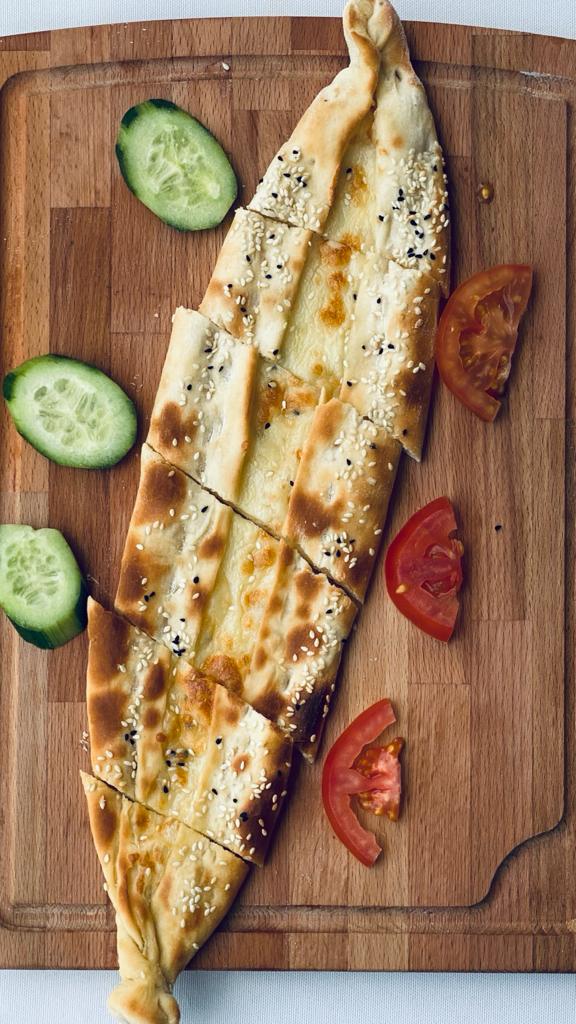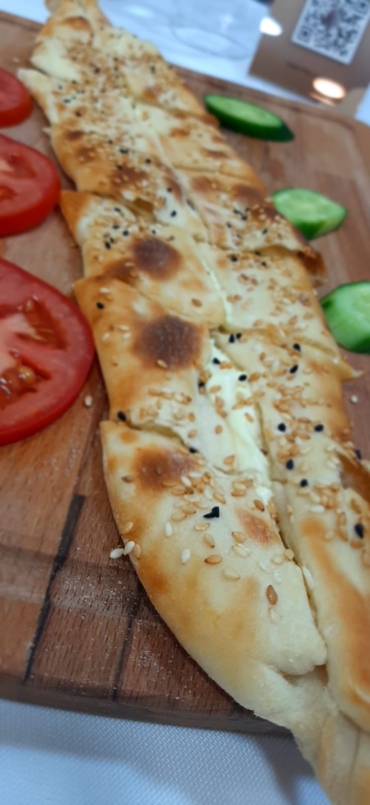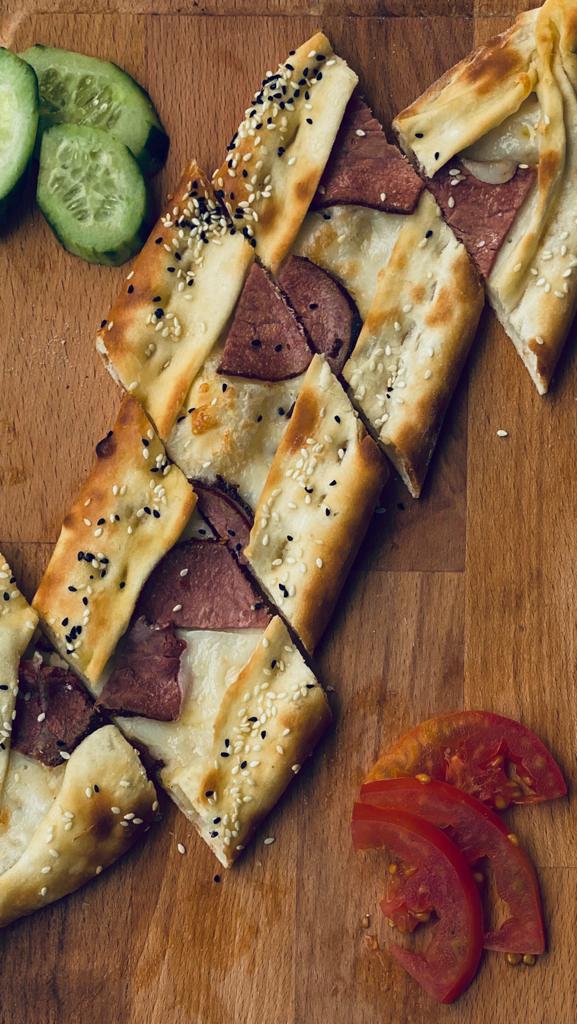 ( turksh pie stuffed lamb meat .bell peppar . Tomato . Garlic ) - ( فطيرة تركية محشوة بقطع لحم الغنم والفلفل الاخضر والطماطم والثوم )
